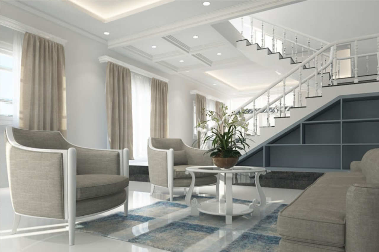 The property offers a large reception with phenomenal ceiling heights and a wraparound terrace, followed by a well-planned kitchen and two spacious bedrooms and bathrooms.